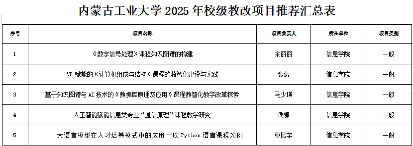 根据《内蒙古工业大学教育教学改革项目管理办法》、《关于征集校级教育教学改革项目选题的通知》的有关规定和《关于组织开展2025年校级教育教学改革项目申报工作的通知》(内工大 教务字〔2025〕14号)文件要求,在各系(中心)申报推荐的基础上,经学院本科教学工作委员会综合评审,现对拟立项的一般项目予以公示,公示时间:2025年4月22日——2025年4月24日。