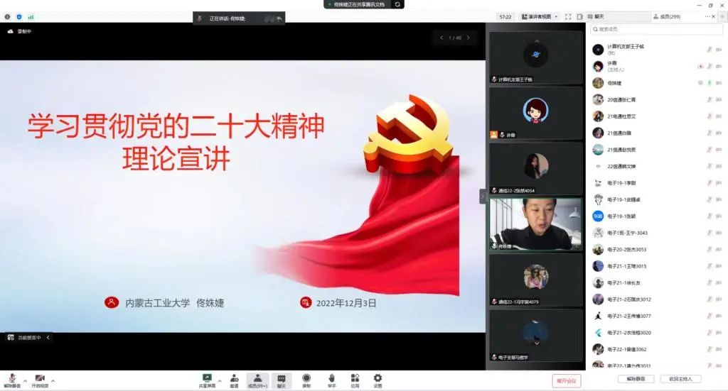 举办专题夜校。12月3日,信息工程学院“学习贯彻党的二十大精神专题夜校”开班。学院党委书记乌迪围绕“以党的二十大精神为引领,在推动学校高质量发展中展现学院新作为”主题,从党的二十大报告的总体框架、突出亮点、以党的二十大精神为引领指导实践3个部分与学院全体教职工进行学习交流,通过线上领学宣讲进一步深化对党的二十大精神核心要义的领会把握。12月4日,组织教职工参观“亮丽内蒙古,奋进新征程,学习宣传贯彻党的二十大精神”网上主题展。学院专题夜校后续将陆续开展专家宣讲、观看政论专题片、主题知识竞赛、撰写评论热议等活动,不断深化学习实效。