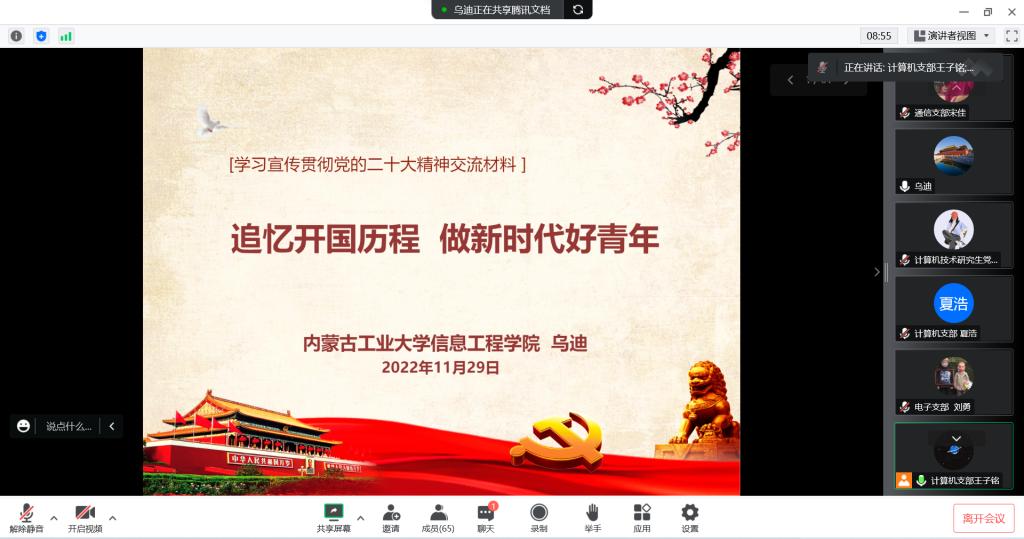 党委书记乌迪以“追忆开过国历程 做新时代好青年”为题,鼓励同学们做有理想、敢担当、能吃苦、肯奋斗的新时代好青年;副研究员王彩玲引导同学们充分认识党的二十大的重要意义;副书记、副院长佟姝婕为同学们深入解读党的二十大精神;学院党委委员许霞就如何做一名合格的大学生党员这一主题为同学们宣讲;校外辅导员翟鹤重点普及大学生保密知识。