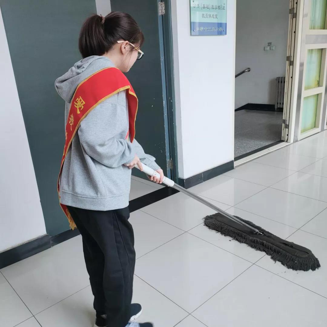 教学楼内,志愿者们积极帮助楼内的保洁阿姨们清扫教室卫生,他们秉承着无私奉献,不求回报的志愿者精神,拿着墩布将教室里每一个角落打扫的干干净净,用抹布将教室内的桌子擦的干干净净,教室楼内的每个角落,在志愿者们的付出下变得一尘不染。