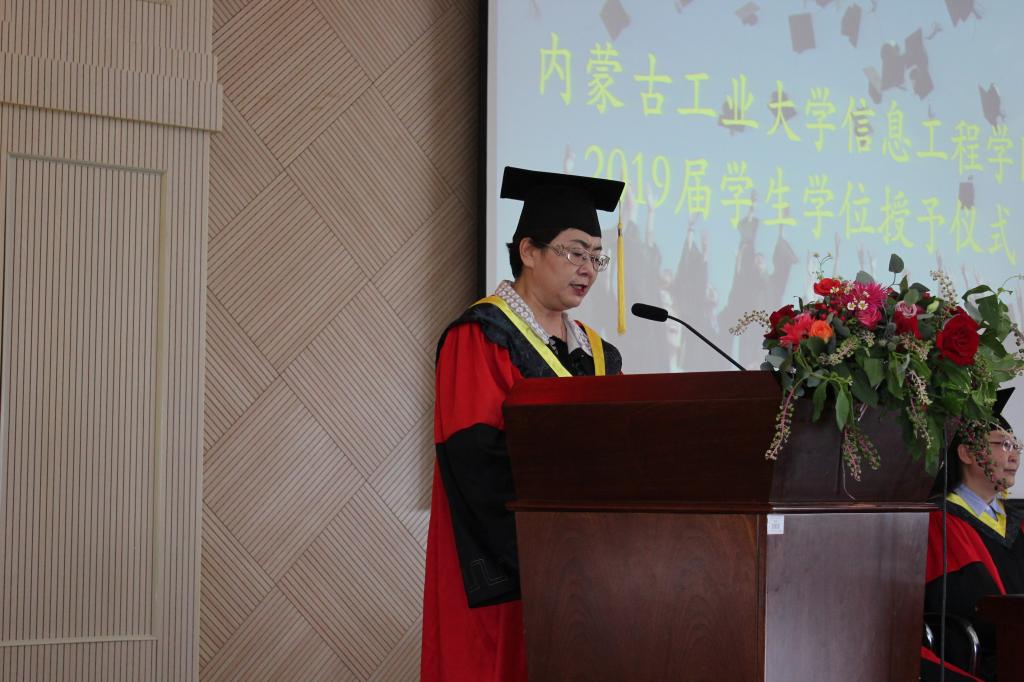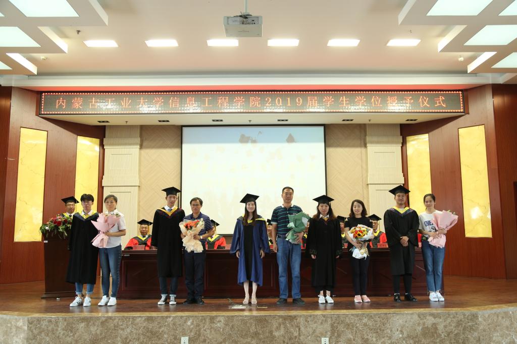 学位授予仪式在铿锵雄壮的国歌声中拉开序幕。学院党委书记王彩玲宣读《关于对2019年优秀硕士论文、本科毕业设计获得者及指导教师表彰的决定》。学院领导为获奖教师及同学颁发荣誉证书。物联网系教师黄建伟、计算机15-1班刘赟、电子17-1班董国钰分别代表教师、毕业生、在校生进行发言。