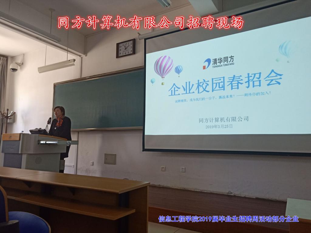 3月25日下午,我院2019届毕业生就业招聘周活动拉开帷幕。三月初以来,学院组织毕业生到各地集中完成毕业实习,月末大部分毕业生都已返校,但很多毕业生工作仍未落实。另外,还有一批考研结果不理想的同学也有就业打算,针对以上情况,学院领导研究决定邀请一些一直以来联系比较密切,岗位需求较大的企业来学院举行现场招聘会。受学院邀请,清华同方股份有限公司领导率先来学院招聘。