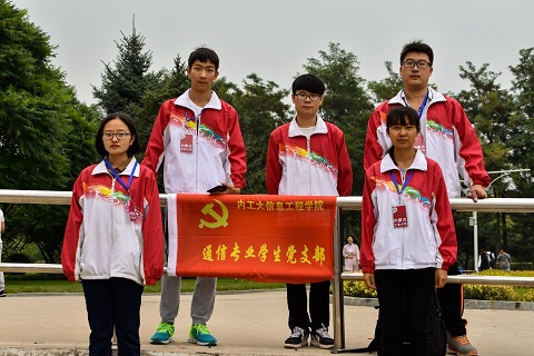 然后,党小组在2017年9月3日上午8.30准时达到了电力大楼正门前,身着统一的红色鲜艳服饰,统一佩戴了党支部准备的内蒙古工业大学工作证,在电力大楼阶梯旁挂立了本支部党旗和信息功能工程学院的大旗,能够让新生们明显的注意到我们,在我们帮助他们时,他们可以没有顾虑的接受我们的帮助,我们也能够同时代表学院来帮助新生。