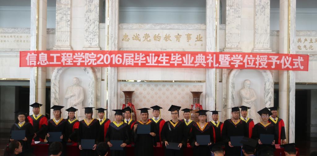 院长李春明教授发表热情洋溢的讲话,他代表学院党政向2016届毕业生表示热烈的祝贺。他说,今天的毕业典礼不是“庆祝”,而是标志着新的“开始”。作为你们的老师,在临别时我们再祝福几句话:一是要脚踏实地,秉承我校“唯实尚行”的校风。要扎扎实实从小事做起,从大处着眼,多些行动,努力做生活的强者。二是要多读书,不断提高。读书、学习、思考、实践对一个人始终是重要的,走出校门,应该是新的学习的开始。他表示,学院不忘初心,始终把人才培养放在办学的首位,努力将信息工程学院建设的更好!学院每位教师都期望同学们的未来的征途上不断进步、一路精彩!他希望同学们毕业后常与母校老师联系,母校欢迎你们常回家看看。
