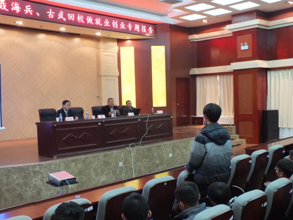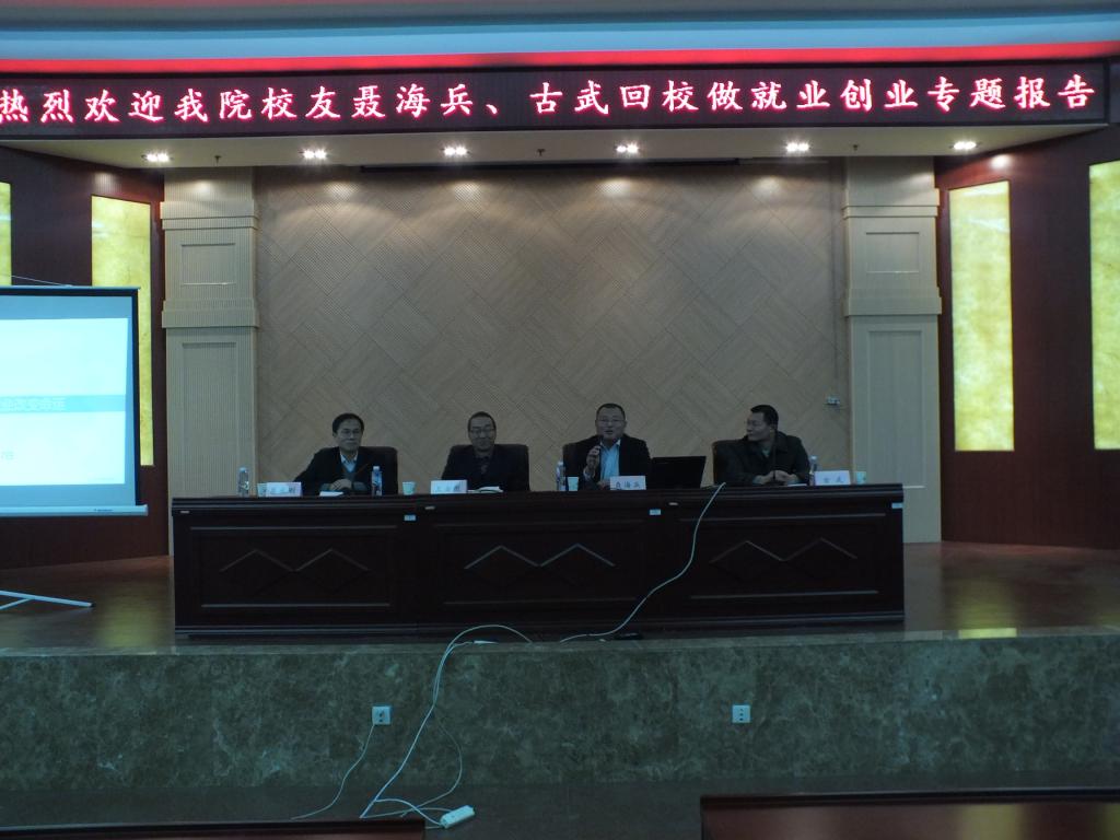 下午,我院邀请二位成功创业的校友回校为在校学生做就业、创业专题讲座。一位是我院95级计算机应用专业校友,北京赛孚信息技术有限公司、内蒙古赛孚信息技术有限公司、内蒙古博易智软技术有限公司三家公司的总经理聂海兵,另一位是我院96级电子工程专业校友,内蒙古大禹科技有限公司总经理古武。