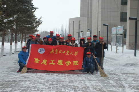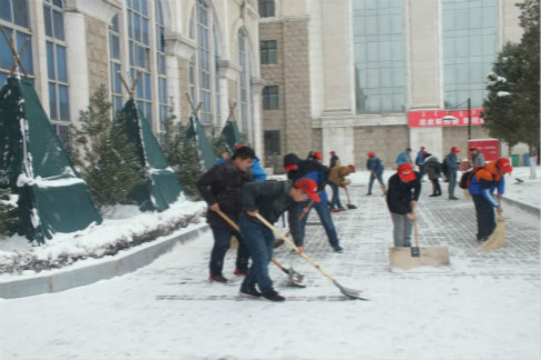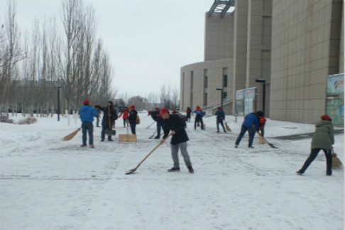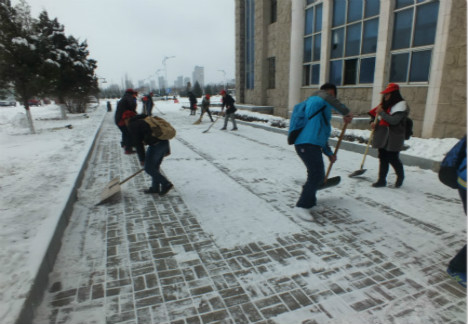 11月24日,为避免道路积雪成冰,影响我校师生的正常出行,我院组织14、15级青年志愿者以“情义工大,我愿我行”为口号,对电力大楼门前及公共教学楼门前的积雪进行义务清理。