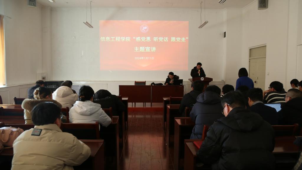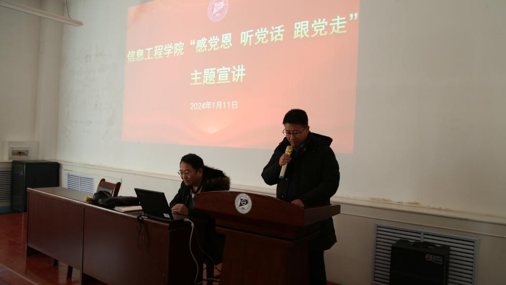 2024年1月11日下午,信息工程学院开展“感党恩 听党话 跟党走”主题宣讲,邀请马克思主义学院硕士研究生导师王大为老师作题为《感党恩、听党话、跟党走---奋力书写中国式现代化内蒙古新篇章》的主题宣讲。学院党委书记乌迪主持,师生代表100余人参加。