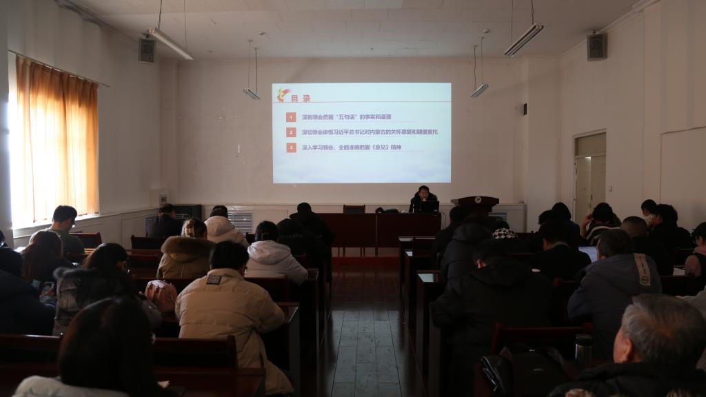 王大为老师围绕深刻领会把握“五句话”的事实和道理、深刻领会体悟习近平总书记对内蒙古的关怀厚爱和期望重托、深入学习领会全面准确把握《关于推动内蒙古高质量发展奋力书写中国式现代化新篇章的意见》精神三个方面,深入浅出、系统生动地进行了“感党恩、听党话、跟党走”主题宣讲。