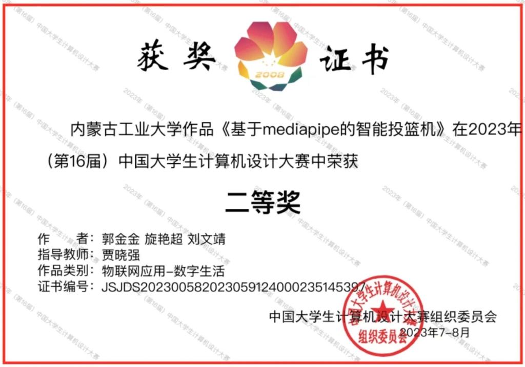 8月13日-8月17日,由贾晓强老师指导,郭金金,旋艳超,刘文靖同学的作品“基于mediapipe的智能投篮机”荣获第十六届中国大学生计算机设计大赛,内蒙古省级赛二等奖,国赛二等奖。