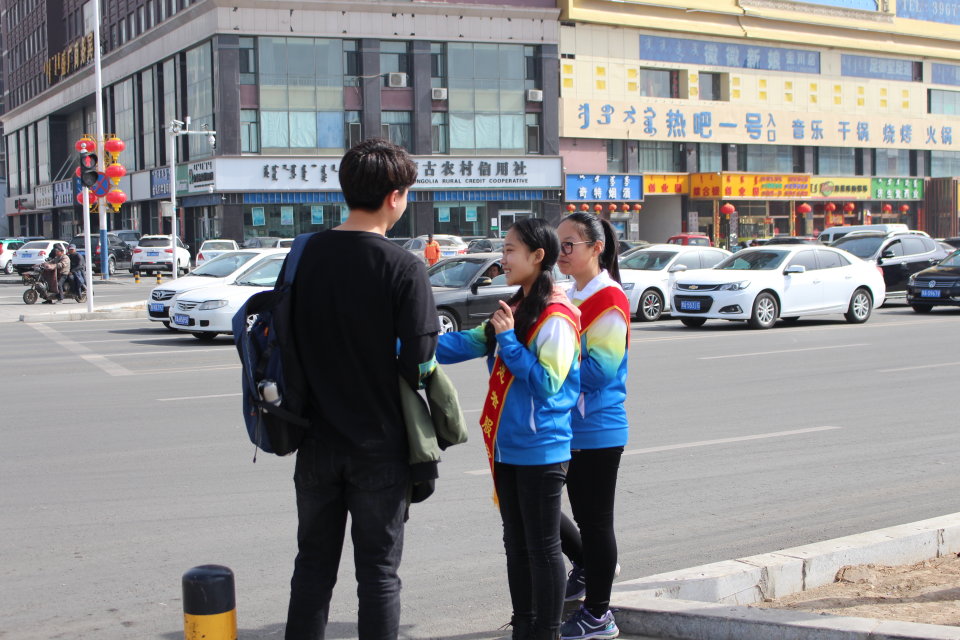 活动之前,志愿者们积极与金川交警支队联系,向交警询问我市交通现状,并成功得到了对此次志愿活动的支持。3月12日上午,志愿者们来到金海路转盘,协助回民队交警们劝导行人遵守交通信号,按道行走;纠正非机动车不按道行驶、闯红灯等交通违法行为。为来往的车辆和人流开辟一条安全的道路。
